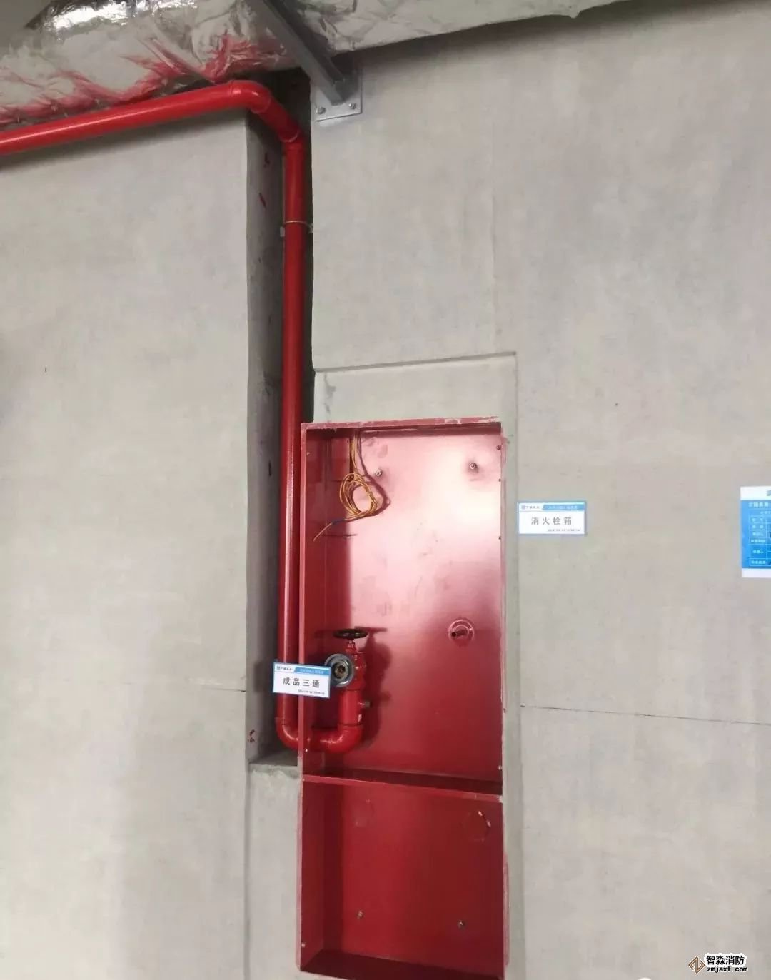 消火栓箱安裝,箱體外填塞密實(shí),管道安裝垂直,栓頭距地1.1米。
