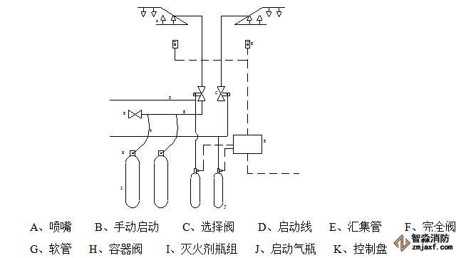 本系統(tǒng)的主要設(shè)備和器材包括:啟動氣瓶、啟動氣瓶、滅火劑瓶組、控制器、選擇閥、安全閥、容器閥、噴嘴等。