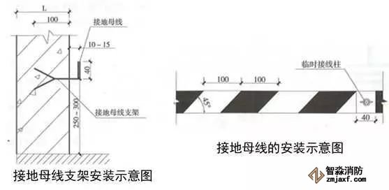 2、配電室接地母線:用扁鋼制作接地母線支架,支架末端加工成燕尾形,埋設深度不小于50mm,出墻平直長度為10~15mm,上彎立面長度為40mm。支架安裝間距為1m,離地面高度為300mm。接地母線應先調(diào)直或煨彎后焊接在支架上,接地母線搭接長度大于等于扁鋼寬度的2倍且三面施焊。每房間設不小于2處的蝴蝶螺母作為臨時接線柱,過門處暗敷埋設,轉角用扁鐵煨制圓弧形,煨彎半徑R≥100mm,穿墻板處加設套管保護。接地母線應刷45°斜向黃綠相間標識油漆,條紋間距100mm,臨時接線柱兩側各留20mm寬度不刷漆。