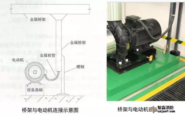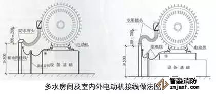 1、電源配管連接:根據(jù)電動機接線盒位置敷設電源管,成排電動機接線盒宜同向排列。電源敷設在靠近接線盒的方向,管口離地高度宜≥300mm,低于電動機接線盒中心100~200mm,室外電源管高度與接線盒中心一致,管口安裝防水彎頭。在距管口50~100mm處焊接接地螺栓。軟管管徑應與電源管同徑,軟管應留有適當余量,兩端采用專用管接頭盒專用盒接頭連接。導線壓倒接線盒內(nèi)的接線端子上。電動機底座、電源管應與接地母線可靠連接。