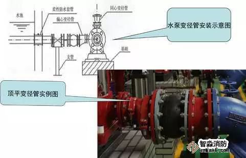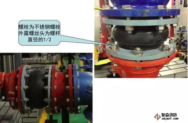 3、水泵吸水、出水變徑管安裝質(zhì)量控制要點:水泵吸水口安裝上平偏心大小頭,出水口安裝同心大小頭,螺栓外露長度不大于螺桿直徑的1/2,且長度一致。
