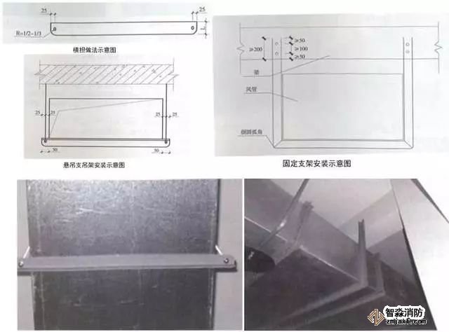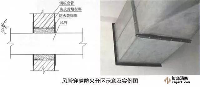 2、風管穿越防火分區(qū)做法:用2mm厚鋼板加工制作風管套管,套管接縫應滿焊,套管尺寸比風管四周尺寸大30~50mm,套管長度與墻面厚度一致。安裝完后用防火材料將套管與風管間隙填塞密實。用2mm厚、30~50mm寬黑色橡膠裝飾圈收口,裝飾圈角部45°拼接。風管穿越防火分區(qū)處必須設防火閥,防火閥距墻分隔墻間距不大于200mm,風管長邊大于630mm時,宜在防火閥兩側設單支吊架。