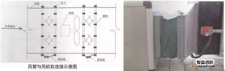 3、風管與風機軟連接:確定風管與風機之間的距離和同心性,距離要求150~200mm,風管、風機同心徑;制作軟接兩端法蘭,中低壓系統(tǒng)法蘭螺栓孔間距120~150mm,高壓及凈化系統(tǒng)距80~100mm,軟接長度為法蘭間距加20~30mm伸縮量,用鉚釘將軟接均勻平整的固定在法蘭上,鉚釘位置和法蘭螺栓位置對應,風機法蘭與風管法蘭螺栓孔對應,螺栓朝向與介質(zhì)流向一致,螺栓外露長度為2~3扣絲。屋面與防暴場所采用不小于4mm²的黃綠雙色銅芯軟線壓接銅鼻子接地跨接。成排風機中心線應在一條線上。