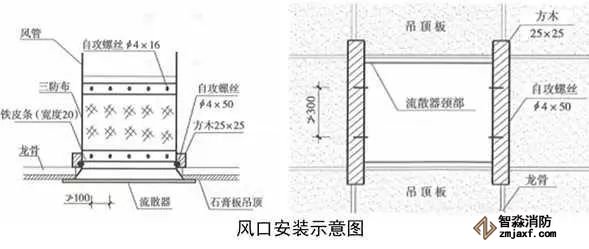 根據(jù)策劃后的圖紙,確定風口位置,在風口頸部用手槍鉆打眼,孔徑4mm,打眼間距不大于100mm,用自攻絲和1.5~2.0mm厚的金屬條將三防布固定到風口頸部。方木防火防腐處理后固定在吊頂龍骨上,用自攻絲將風口固定在方木上,自攻絲間距不大于300mm,校正風口,與吊頂結合嚴密。