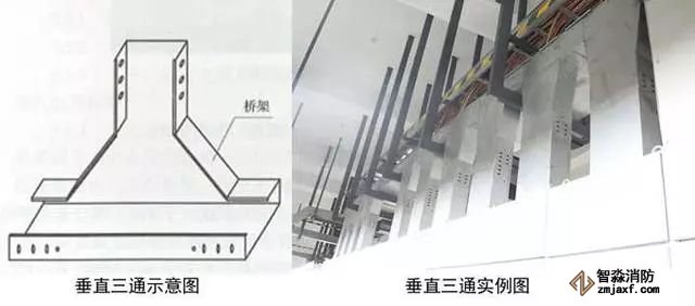 2、橋架三通安裝:根據(jù)電纜橋架走向,按照最大電纜直徑的10~15倍選擇三通形式和彎曲半徑。在距三通接口500mm處設置支架,橋架寬度大于800mm時,應在三通底部增加支架。兩段橋架與橋架、橋架與支架之間跨接接地。
