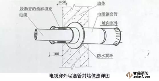 2、電源管穿外墻做法:在穿外墻位置敷設套管,宜內(nèi)高外低并設止水翼環(huán),管徑為電纜外徑的2倍,長度為每邊出墻面100mm。有散水時應伸出散水外邊沿100mm,套管兩端制作喇叭口,內(nèi)壁刷防銹漆,外壁出墻刷瀝青漆。電纜穿入套管后,兩端嵌入瀝青麻絲,瀝青麻絲在套管內(nèi)填充密實,距管口深度大于50mm,并應使電纜在套管內(nèi)居中。