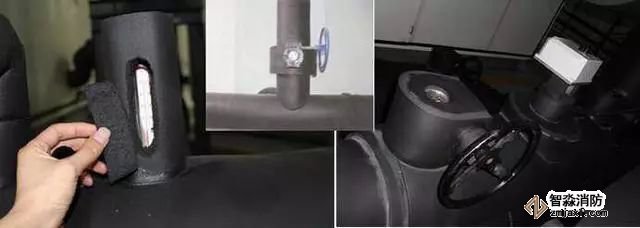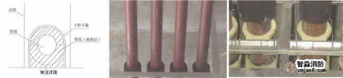 質(zhì)量控制要點:橡塑管(板)與管托粘接、卡環(huán)處預留寬度。采用木托時,防腐處理應到位。管托厚度不得小于絕熱層厚度,接點緊密,表面平整,不得有冷熱橋現(xiàn)象。