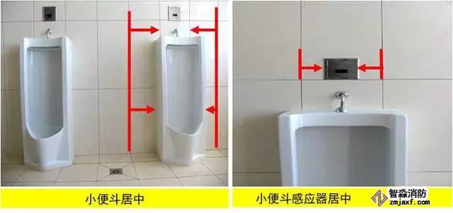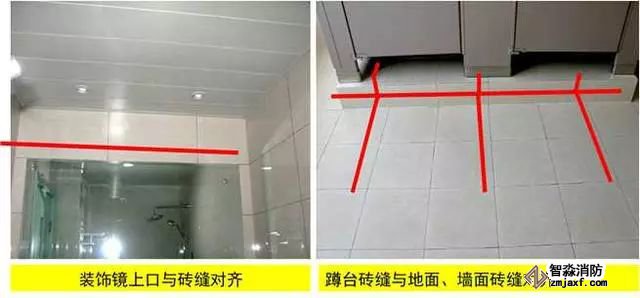 質(zhì)量控制要點:器具、排水管、配件等與墻、地面磚居中、對縫,周邊打膠光滑密實。成排器具安裝應排列整齊,高度一致,間距均勻。