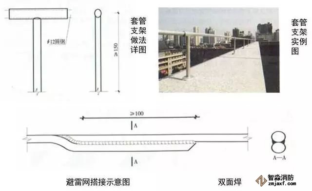 3、圓鋼避雷帶敷設:按設計位置彈線、定位,一般情況下,避雷帶應居女兒墻(屋脊)中心,當女兒墻寬度大于300mm時,支架布設于距外沿150mm處,距變形縫、轉彎300mm處設支架,直線段支架均勻分布,間距不大于1m;支架埋深不小于80mm,出女兒墻頂面不小于150mm,調(diào)整、校正支架的垂直度,根部套不銹鋼裝飾圈并用耐候膠密封固定。圓鋼調(diào)直后敷設在支架上,轉彎、搭接、變形縫處圓鋼煨彎加工,轉彎處煨彎半徑為80~100mm,搭接處一端鋼筋煨乙字彎,與另一端圓鋼上下搭接,搭接長度為100mm,搭接點宜設在離支架不小于200mm位置處,雙面施焊,焊縫連接飽滿,焊渣清理干凈,焊接點應先刷防銹漆,再刷銀粉漆,防腐處理到位;變形縫處鋼筋煨成向下半圓形。將防雷引下線可靠焊接在避雷帶上。拉通線校正避雷帶的高度、平直度。