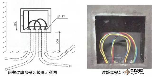 1、過路接線盒:在導管敷設時,按照規(guī)范要求在適當位置設置過路接線盒。過路盒安裝時距地高度宜為300mm;在結構板內(nèi)安裝過路盒時,應用扎絲綁緊,盒內(nèi)填充密實,表面用膠帶密封;導管應垂直進入線盒,焊接管絲頭伸入線盒內(nèi)長度不大于5mm,盒子內(nèi)外鋼管鎖母上緊,(或KBG、JDG管可用盒接頭與過路接線盒連接)接地,用φ6圓鋼在焊管間、焊管與過路盒間進行接地跨接;盒內(nèi)穿線應留有適當余量;管口加護口;安裝過路盒面板,面板緊貼墻面或頂面。