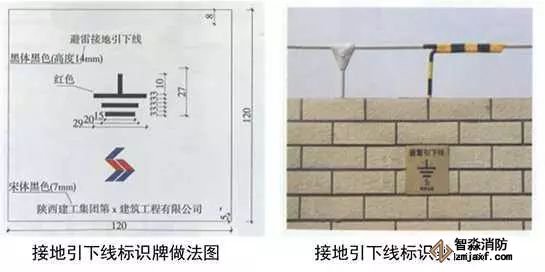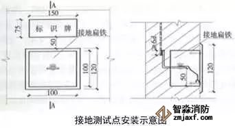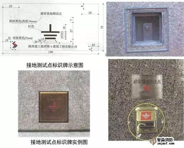 1、避雷接地測試點:預埋扁鐵鋼及100x100x50線盒,線盒與墻面平齊,鍍鋅扁鋼鉆φ12孔,安裝防松墊片及蝴蝶螺母,螺母居預埋盒中心。編織軟銅線一端連接在蝴蝶螺母上,另一端壓接銅鼻子用于接地測試。銅質(zhì)面板用螺絲固定在預埋盒上,在測試點正上方50mm處粘貼銅質(zhì)或不銹鋼標識牌,標識牌應標明接地測試地點、接地符號、施工單位、編號,標高尺寸及位置與相鄰沉降觀測點及標識牌一致。