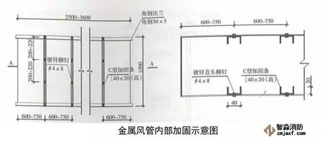 大口徑(b≥2500mm)鍍鋅鋼板風管加固:利用1.2mm厚的鍍鋅鋼板制作C形條,沿風管寬度方向?qū)形條按600~750mm間距鉚接。鉚釘按200~220mm間距鉚接在風管內(nèi)側。加固完成后安裝風管兩側法蘭。