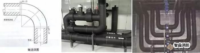 2、保溫管道穿墻處理:保溫管道穿墻、板時,保溫層應連續(xù)。應采用橡塑保溫管(板)進行穿墻、穿樓板保溫,用橡塑專用膠粘接牢固,接縫嚴密,兩端與墻面平齊,對接嚴密平整,兩側加牢固規(guī)整裝飾圈保護。保溫管(板)與墻、板面根部應粘貼裝飾圈,接縫應放在頂部或正視不明顯處,裝飾圈寬度20~50mm。