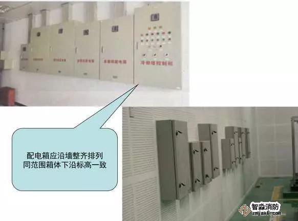 2)配電箱應沿墻整齊排列,同范圍箱體下沿標高一致。箱體高度600mm以內(nèi),底邊距地1.5m;箱體高度600~800mm,底邊距地1.2m;箱體高度800~1000mm,底邊距地1.0m;箱體高度1000~1200mm,底邊距地0.8m;箱體高度1200mm以上落地安裝;預空間滿足安全距離及檢修空間要求;