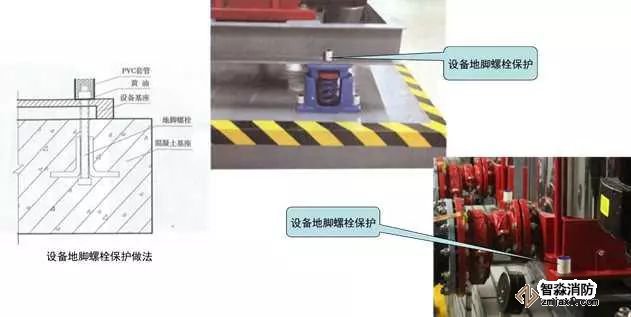 2、設備地腳螺栓防水防腐保護:對室外和多水房間安裝的設備地腳螺栓,根據(jù)設備地腳螺母大小及螺栓外露長度確定套管的直徑及高度,成排或同一區(qū)域內(nèi)螺栓外露長度應一致,以確保套管高度一致且覆蓋螺栓頂面5mm。套管直徑與螺母直徑匹配,套管安裝后用黃油填塞套管與螺栓之間的間隙,上口與套管平齊。