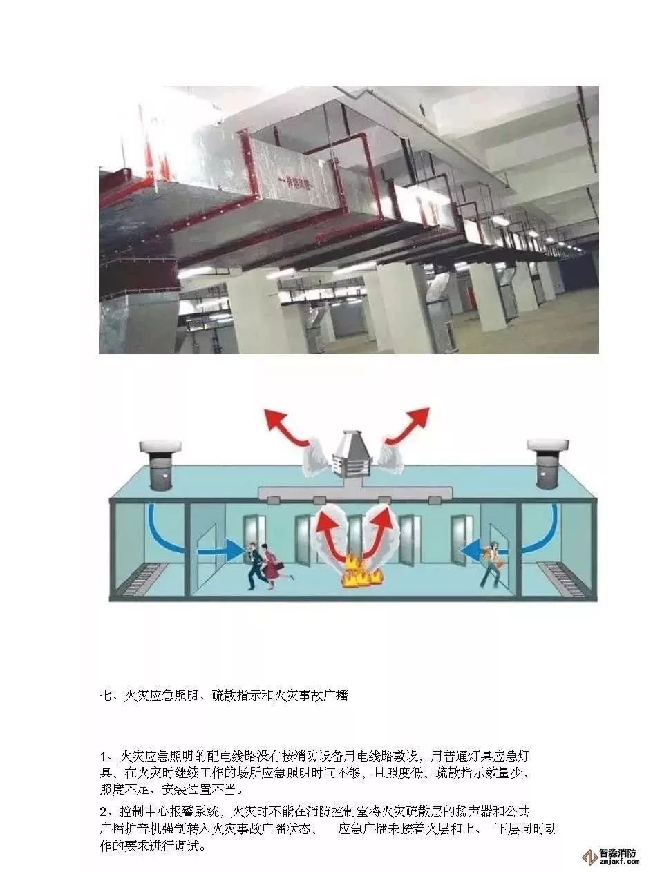 6.商業(yè)營業(yè)廳內(nèi)店鋪裝修時,廣告牌和門頭下垂高度大于50cm,形成獨(dú)立的防煙分區(qū),但未設(shè)排煙口。主要是因?yàn)榈赇佋趦?nèi)部裝修時不經(jīng)統(tǒng)一審核,設(shè)計單位不能及時提醒造成的。遇到此類問題,一般要求廣告牌在排煙口附近位置留缺口或增設(shè)排煙口。