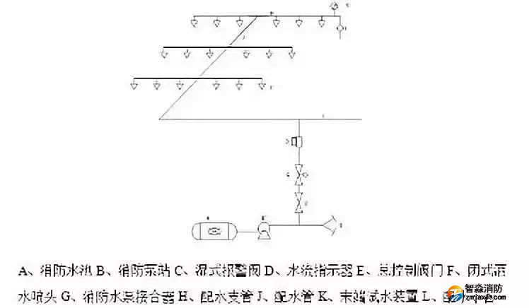自動噴水滅火系統(tǒng)由水源、加壓送水、報警閥、管網(wǎng)噴頭以及火災(zāi)探測系統(tǒng)等組成。本自動噴水滅火系統(tǒng)屬于濕式自動噴水滅火系統(tǒng)。其結(jié)構(gòu)如下圖: