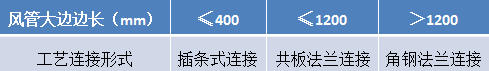 根據(jù)施工現(xiàn)場(chǎng)具體情況,采用角鋼法蘭、共板法蘭和插條式連接三種工藝連接或者聯(lián)合使用。工藝及風(fēng)管邊長(zhǎng)劃分、風(fēng)管鋼板厚度如下: