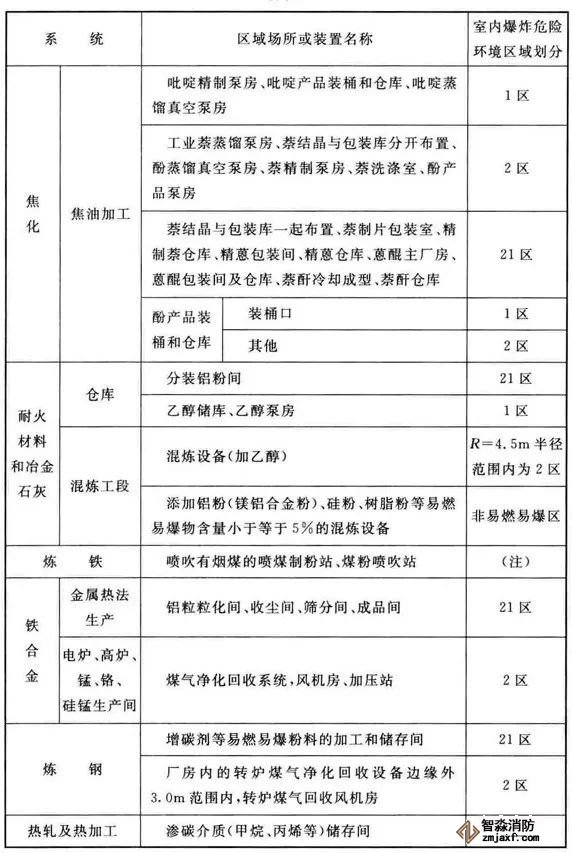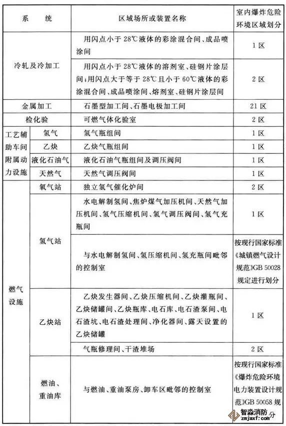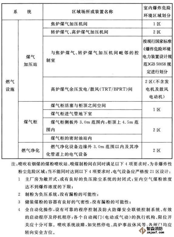 3、可能散發(fā)可燃氣體、可燃蒸氣的煤氣凈化系統(tǒng)的鼓冷、脫硫、粗苯、油庫,苯精制,焦爐地下室,煤氣燒嘴操作平臺等工藝裝置區(qū)和儲運區(qū)等,在其爆炸危險環(huán)境2區(qū)內(nèi)以及附加2區(qū)內(nèi)(具體如下表爆炸危險環(huán)境區(qū)域劃分),應(yīng)設(shè)置可燃氣體探測報警系統(tǒng)。