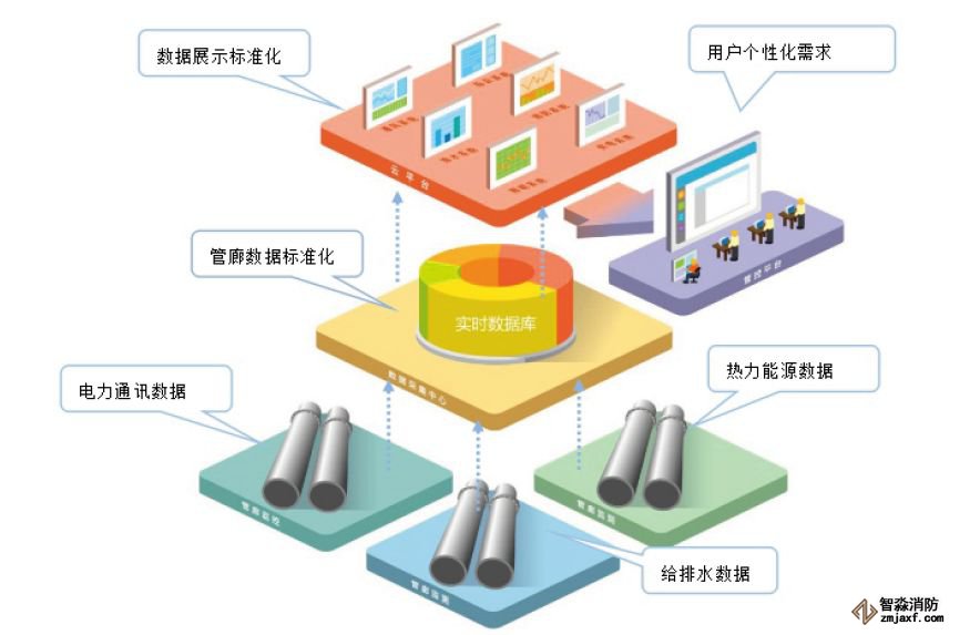 井下所有的信息都要傳到平臺監(jiān)控中心,而監(jiān)控中心的各種控制命令則要傳輸?shù)礁鞫喂芾鹊母鞣N設備上。在此基礎上,用戶可以很順利的處理來自不同設備及環(huán)境的數(shù)據(jù),滿足末端設備擴展需求。管廊數(shù)據(jù)標準化、數(shù)據(jù)展示標準化、電力通訊數(shù)據(jù)、熱力能源數(shù)據(jù)、給排水數(shù)據(jù)、用戶個性化需求,利用物聯(lián)網(wǎng)對地下管廊進行感知和識別,通過網(wǎng)絡互聯(lián)進行傳輸、計算、處理和數(shù)據(jù)挖掘,實現(xiàn)對地下管廊的實時控制、精確管理和科學決策。