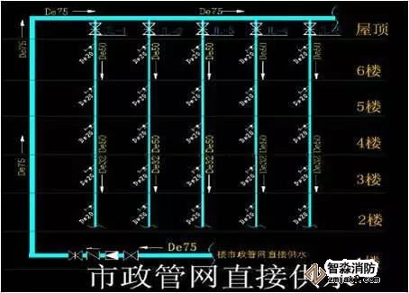 當(dāng)市政供水管網(wǎng)接入到分店屋頂(或最高樓層,管徑De90以上),出水口的壓力能夠長期穩(wěn)定在0.15MPa以上時(shí),則可采取此種方式直接供水。