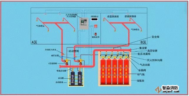 該系統(tǒng)由滅火劑儲(chǔ)存裝置、總控閥、驅(qū)動(dòng)器、噴頭、管道超壓泄放裝置、信號(hào)反饋裝置、控制器等組成。