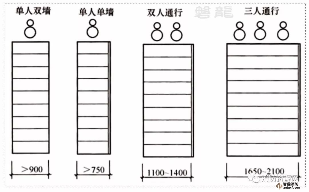 注:樓梯梯段凈寬在防火標(biāo)準(zhǔn)中是以每股人流為0.55m計(jì),并規(guī)定按兩股人流最小寬度不應(yīng)小于1.10m,這對(duì)疏散樓梯是適用的,而對(duì)住宅套內(nèi)樓梯、維修專用樓梯外的其他平時(shí)用作日常主要交通的樓梯不完全適用,尤其是人員密集的公共建筑(如商場(chǎng)、劇場(chǎng)、體育館等)主要樓梯應(yīng)考慮多股人流通行,使垂直交通不造成擁擠和阻塞現(xiàn)象。此外,人流寬度按0.55m計(jì)算是最小值,實(shí)際上人體在行進(jìn)中有一定擺幅和相互間空隙,因此本條規(guī)定每股人流寬度為0.55m+(0~0.15)m,(0~0.15)m即為人流眾多時(shí)的附加值,單人行走樓梯梯段寬度還需要適當(dāng)加大,見下圖。