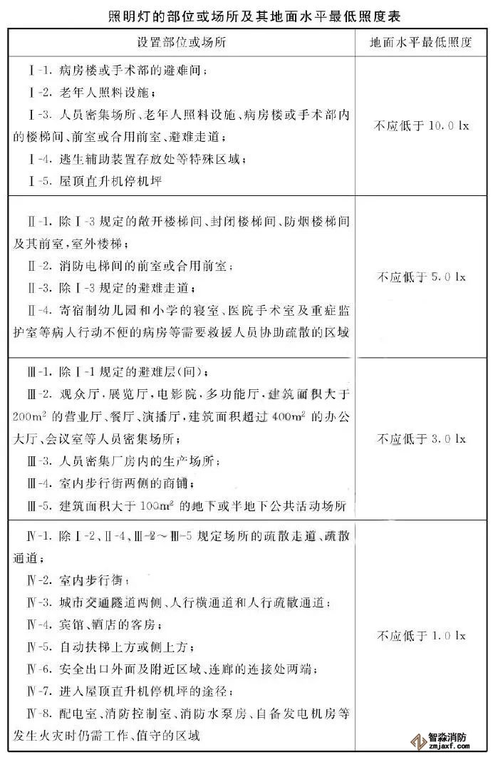 5、照明燈應(yīng)采用多點、均勻布置方式,建、構(gòu)筑物設(shè)置照明燈的部位或場所疏散路徑地面水平最低照度應(yīng)符合下表的規(guī)定。