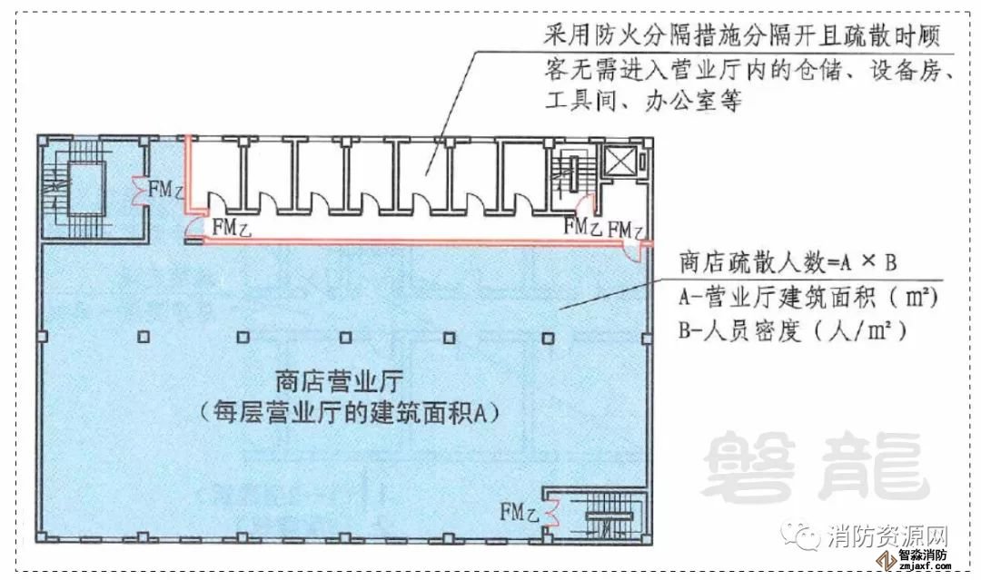 注1:本條所指“營(yíng)業(yè)廳的建筑面積”,既包括營(yíng)業(yè)廳內(nèi)展示貨架、柜臺(tái)、走道等顧客參與購(gòu)物的場(chǎng)所,也包括營(yíng)業(yè)廳內(nèi)的衛(wèi)生間、樓梯間、自動(dòng)扶梯等的建筑面積。對(duì)于進(jìn)行了嚴(yán)格的防火分隔,并且疏散時(shí)無需進(jìn)入營(yíng)業(yè)廳內(nèi)的倉(cāng)儲(chǔ)、設(shè)備房、工具間、辦公室等,可不計(jì)入營(yíng)業(yè)廳的建筑面積。