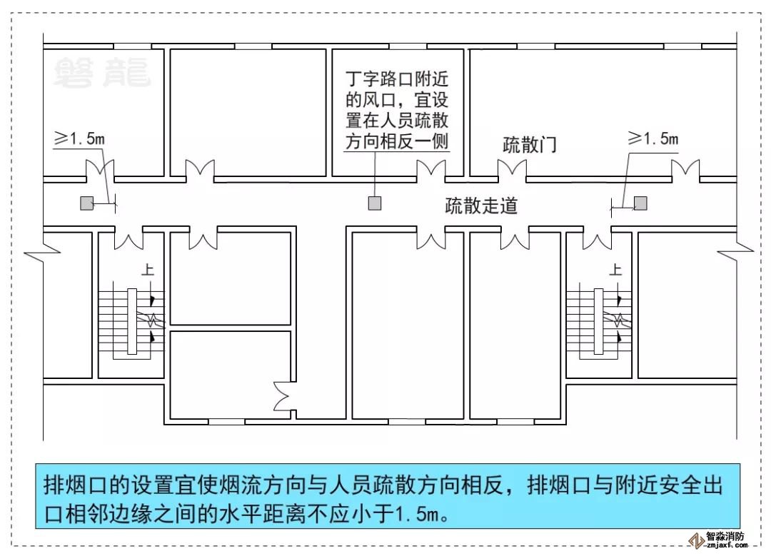 對于T字形或回形疏散走道,必須輔以正確的疏散指示標(biāo)志和應(yīng)急照明系統(tǒng),對于設(shè)置機(jī)械排煙系統(tǒng)的疏散走道,排煙口的設(shè)置宜使煙流方向與人員疏散方向相反。