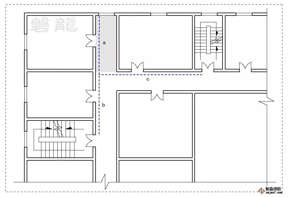 注:本圖示僅有一個方向能到達(dá)安全出口,不應(yīng)許可。確有需要時,宜按袋形走道處理,按最不利情況下的折返長度(2a+2b+c)計(jì)算疏散距離。比如,一二耐火等級的高層教學(xué)建筑:(2a+2b+c)≤15m。