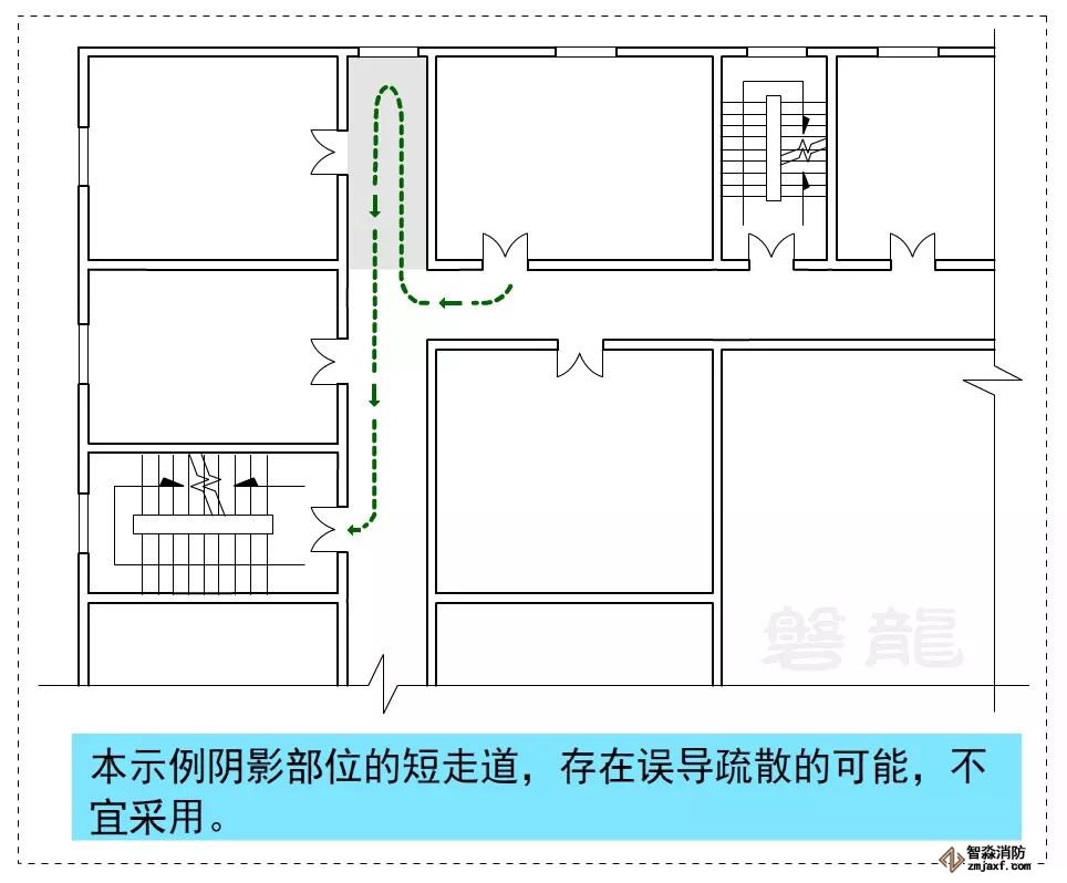 圖示7、圖示8所示的疏散走道,示例部位形成回形疏散路徑,沒有安全出口,不應(yīng)采用。