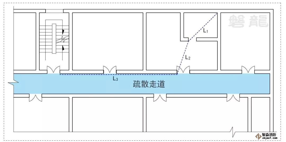 3、確因功能需要,嵌套(穿套)設(shè)置的房間不應(yīng)超過一級,疏散距離應(yīng)按人員行走的直線距離計算,在圖示4的公共建筑中,示例房間內(nèi)任一點至房間直通疏散走道的疏散門的直線距離,應(yīng)為L1+L2。