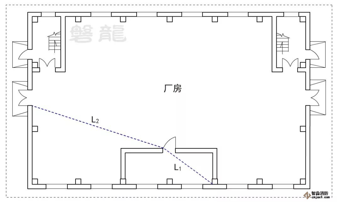 2、廠房倉庫同樣不應(yīng)采用嵌套(穿套)設(shè)置的方式,確因功能需要,嵌套(穿套)設(shè)置的房間不應(yīng)超過一級,疏散距離應(yīng)按人員行走的直線距離計算,在圖示6的廠房中,示例房間內(nèi)任一點至安全出口的直線距離,應(yīng)為L1+L2。