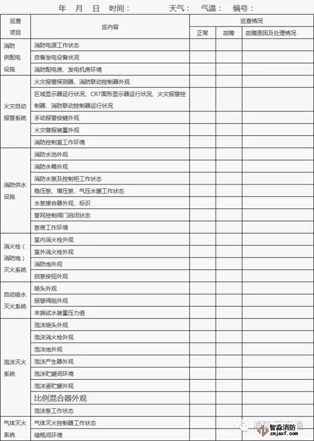 4、附表中各項目情況正常打“√”,存在問題或故障的打“×”;對發(fā)現(xiàn)的問題應(yīng)及時處理,當(dāng)場不能處置的要填報《建筑消防設(shè)施故障處理記錄》。
