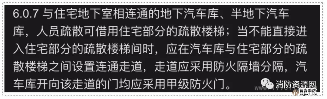 3、與住宅地下室相連通的地下汽車庫(或半地下汽車庫),汽車的人員疏散,可借用住宅部分的疏散樓梯,詳見《 汽車庫、修車庫、停車場設計防火規(guī)范》6.0.7