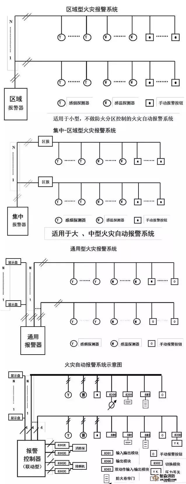 (2)集中報警系統(tǒng):由集中火災報警控制器、區(qū)域(火災)報警控制器和火災探測器組成的功能較復雜的系統(tǒng)。