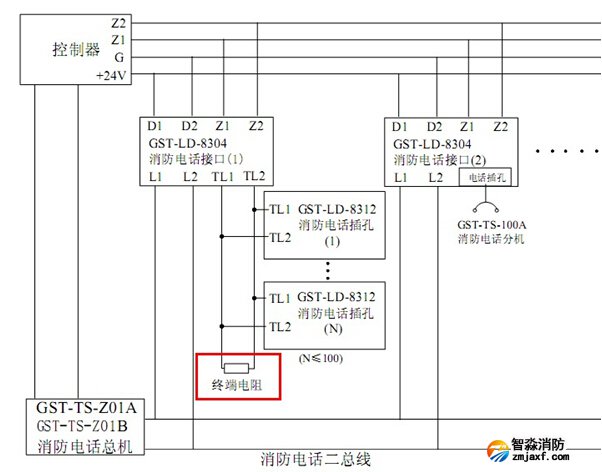 海灣電話(huà)插孔8312接線(xiàn)末端接4.7kΩ終端電阻