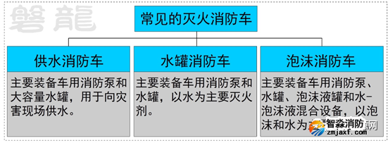 滅火消防車主要裝備滅火裝置,用于撲滅各類火災(zāi),主要分為14類:水罐消防車、供水消防車、泡沫消防車、干粉消防車、干粉泡沫聯(lián)用消防車、干粉水聯(lián)用消防車、氣體消防車、壓縮空氣泡沫消防車、泵浦消防車、高倍泡沫消防車、水霧消防車、高壓射流消防車、機(jī)場(chǎng)消防車、渦噴消防車等。其中,常見的主要有水罐消防車、供水消防車、泡沫消防車等。
