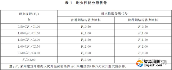 1、鋼結構防火涂料的耐火極限分為:0.50 h、1.00 h、1.50h、2.00h、2.50h和3.00h。普通鋼結構防火涂料用Fp表示,特種鋼結構防火涂料用Ft表示。