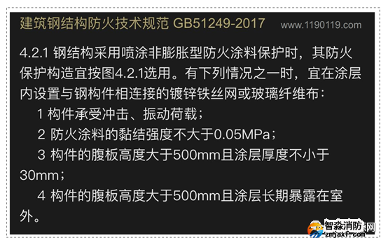 1、根據(jù)《建筑鋼結構防火技術規(guī)范4.2.1執(zhí)規(guī)定,部分涂層內應設置與鋼構件相連接的鍍鋅鐵絲網(wǎng)或玻璃纖維布: