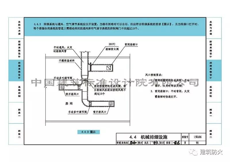 4、第98頁的“4.4.3圖示”中排煙支管上增加了“280℃排煙防火閥”,刪除了“風(fēng)口控制要求”中“常閉排煙口”280℃自動關(guān)閉的字樣。
