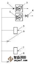 1-排風(fēng)機(jī);2-排煙防火閥及止回閥;3-排煙風(fēng)機(jī);4-止回閥或電動(dòng)風(fēng)閥;5、7-排煙口;6、8-排風(fēng)口