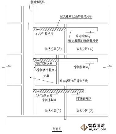 4.當(dāng)排煙管道豎向穿越防火分區(qū)時(shí),垂直風(fēng)道應(yīng)設(shè)在管井內(nèi),且排煙井道必須要有1.00h的耐火極限。當(dāng)排煙管道水平穿越兩個(gè)及兩個(gè)以上防火分區(qū)時(shí),或者布置在走道的吊頂內(nèi)時(shí),為了防止火焰燒壞排煙風(fēng)管而蔓延到其他防火分區(qū),要求排煙管道應(yīng)采用耐火極限1.50h的防火風(fēng)道,其主要原因是耐火極限1.50h防火管道與280℃排煙防火閥的耐火極限相當(dāng),可以看作防火閥的延伸,另外,可以精簡防火閥的設(shè)置,減少誤動(dòng)作,提高排煙的可靠性。