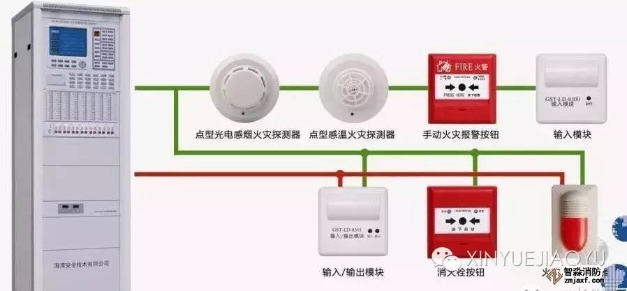 火災(zāi)自動(dòng)報(bào)警系統(tǒng)通常由觸發(fā)裝置如火災(zāi)探測(cè)器、報(bào)警裝置如火災(zāi)報(bào)警控制器、警報(bào)裝置如聲光報(bào)警器、聯(lián)動(dòng)控制裝置如總線控制盤(pán)與控制模塊、電源等組成。