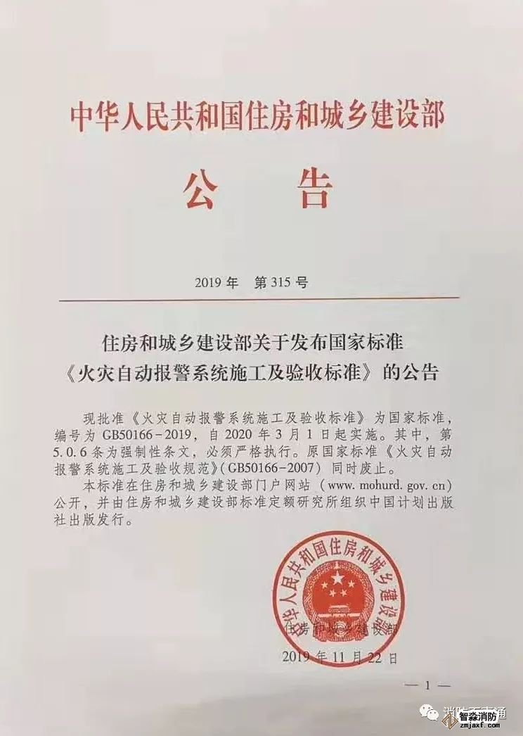 現(xiàn)批準(zhǔn)《火災(zāi)自動(dòng)報(bào)警系統(tǒng)施工及驗(yàn)收標(biāo)準(zhǔn)》為國家標(biāo)準(zhǔn),編號(hào)為GB50166-2019,自2020年3月1日起實(shí)施。其中,第5.0.6條為強(qiáng)制性條文,必須嚴(yán)格執(zhí)行。原國家標(biāo)準(zhǔn)《火災(zāi)自動(dòng)報(bào)警系統(tǒng)施工及驗(yàn)收規(guī)范》(GB50166-2007)同時(shí)廢止。