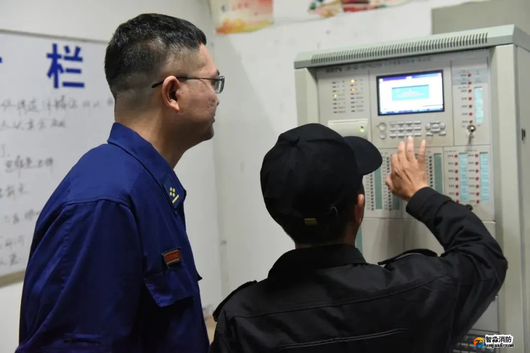 消防值守人員演示著火時消防控制室消防聯(lián)動控制器如何報警。