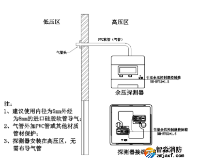 4. 余壓探測器應(yīng)設(shè)置在樓梯間、前室區(qū)域疏散門側(cè),距頂0.2至0.5米壁掛安裝,采用底座直接固定在預(yù)埋86盒上;