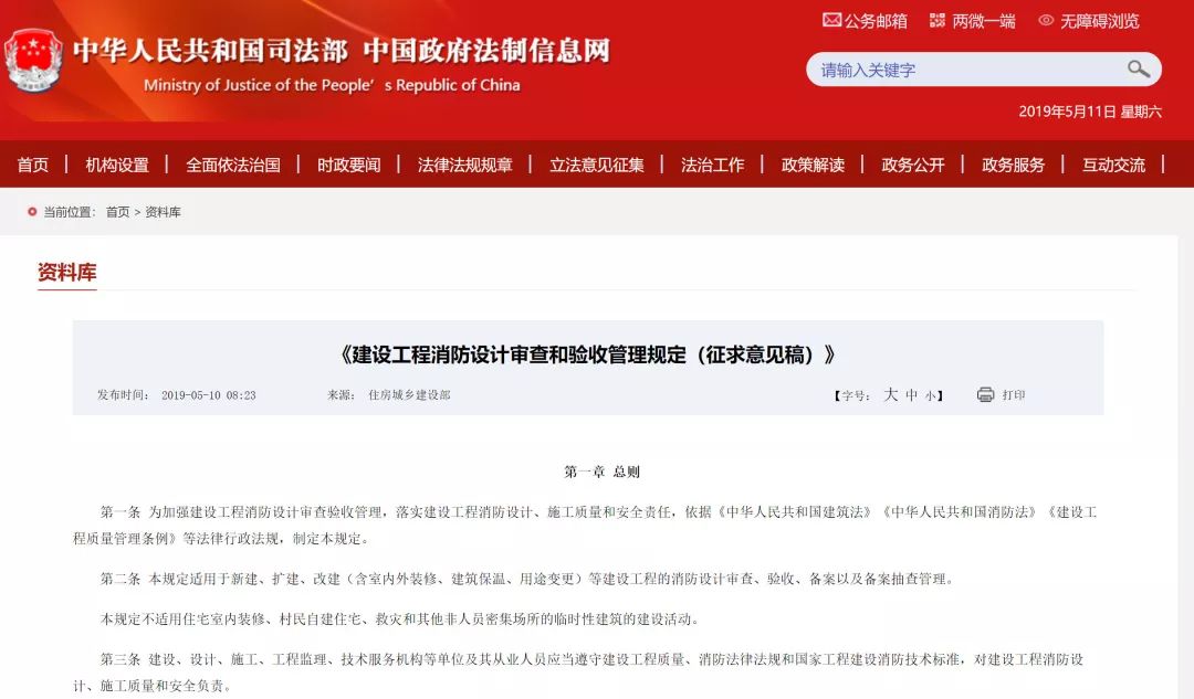 2019年5月10日,中國(guó)政府法制信息網(wǎng)發(fā)布:住房和城鄉(xiāng)建設(shè)部關(guān)于《建設(shè)工程消防設(shè)計(jì)審查和驗(yàn)收管理規(guī)定(征求意見(jiàn)稿)》公開(kāi)征求意見(jiàn)的通知。