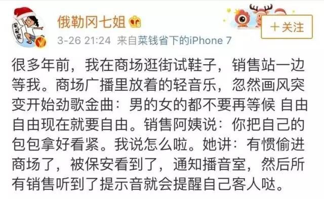 帖子說的是,微博網(wǎng)友發(fā)帖稱,逛商場(chǎng)時(shí),如果商場(chǎng)的背景音樂畫風(fēng)突變,這有可能是商場(chǎng)發(fā)現(xiàn)有小偷“來訪”的警告!